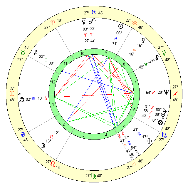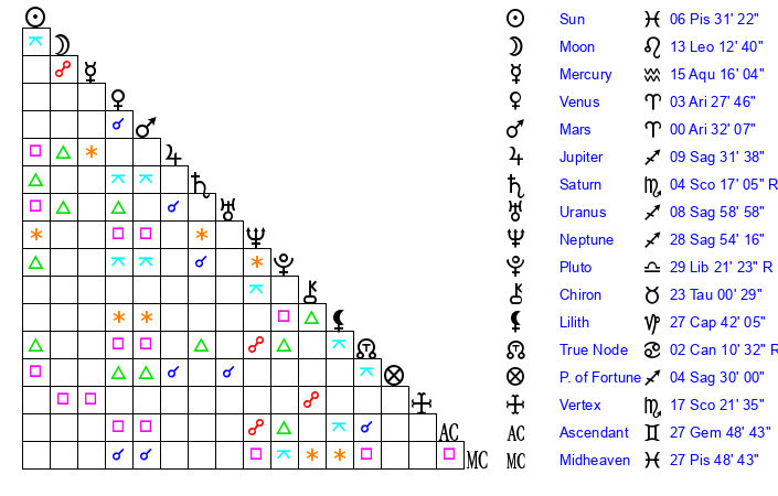 | Moon | 13 Leo 28 | 6 Aquarius 26 | 24 Aquarius 32 |