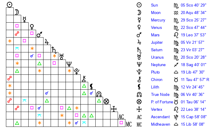 | Sun | 5 Scorpio 40 | 6 Scorpio 31 | 22 Sagittarius 6 |