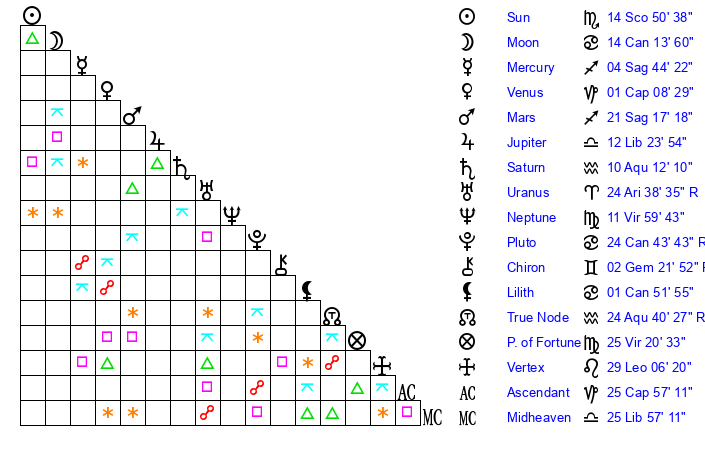 | Moon | 14 Cancer 16 | 16 Gemini 2 | 22 Scorpio 20 |