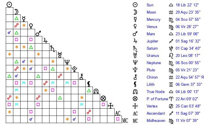 | Sun | 18 Libra 22 | 19 Libra 37 | 23 Sagittarius 44 |