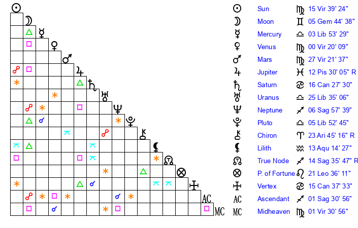 | Sun | 15 Virgo 39 | 16 Virgo 18 | 5 Scorpio 53 |