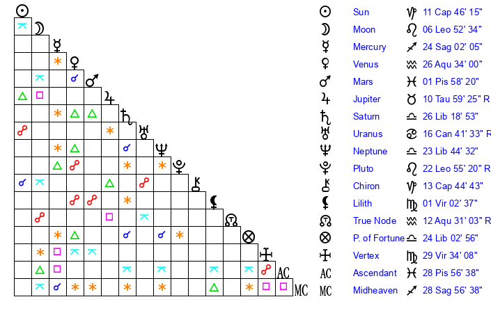 | Moon | 6 Leo 48 | 13 Aquarius 40 | 24 Pisces 37 |