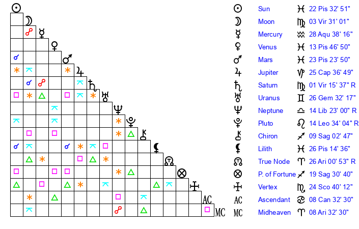 | Neptune | 14 Libra 22 | 29 Pisces 21 | 12 Libra 34 |
