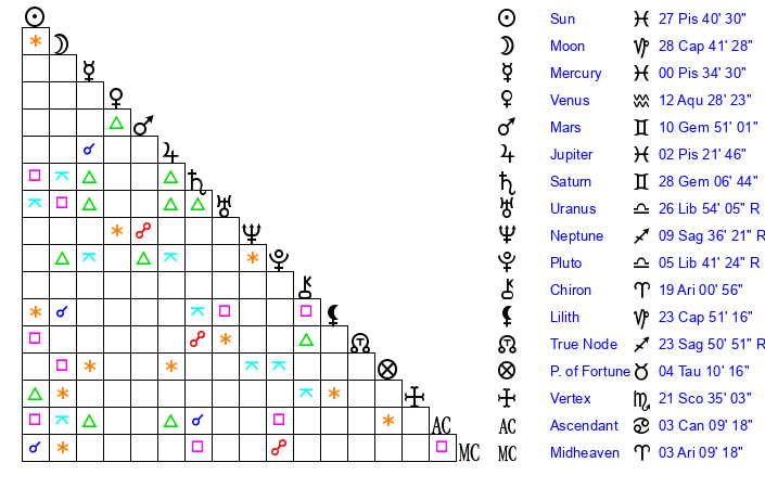 | Neptune | 9 Sagittarius 35 | 29 Pisces 33 | 8 Sagittarius 47 |