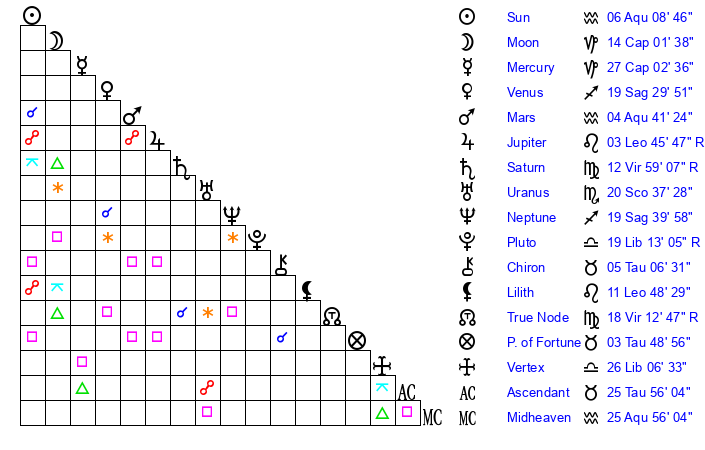 | Sun | 6 Aquarius 9 | 7 Aquarius 0 | 22 Pisces 31 |