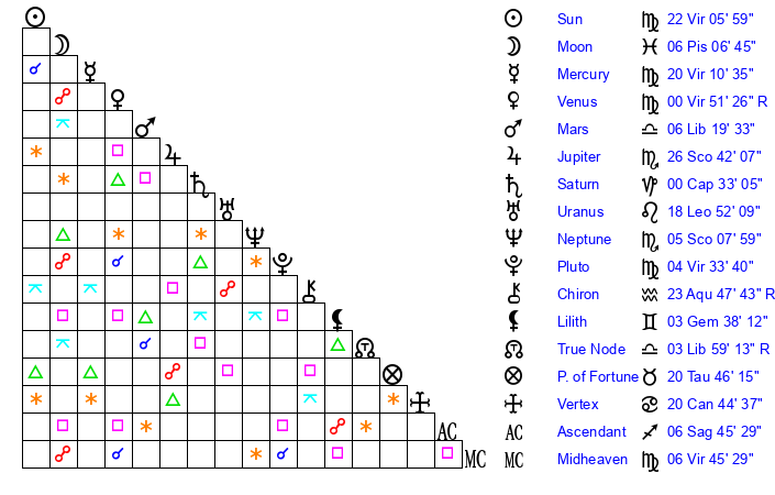 | Sun | 22 Virgo 6 | 23 Virgo 6 | 27 Scorpio 37 |