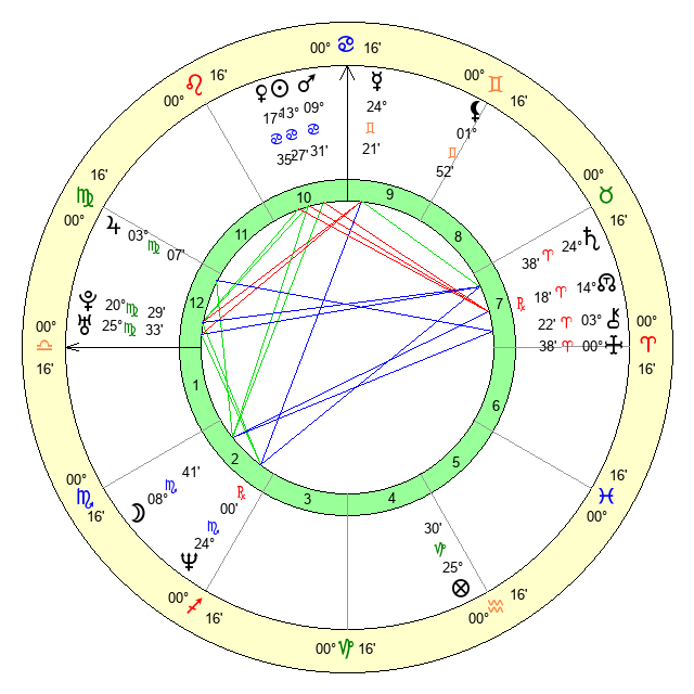 | Venus | 17 Cancer 36 | 0 Gemini 54 | 27 Virgo 46 |