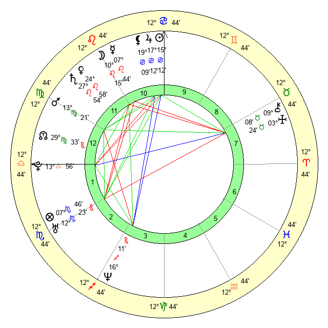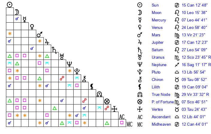 | Sun | 15 Cancer 13 | 15 Cancer 50 | 0 Virgo 12 |