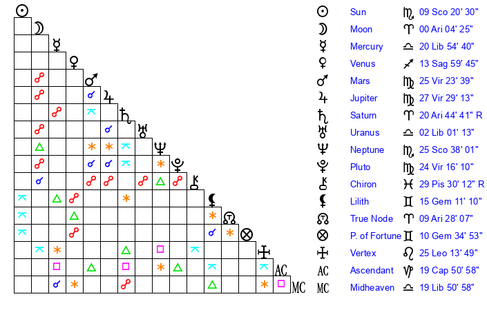 Moon | 0 Aries 0 | 11 Scorpio 46 | 18 Aries 50 |
