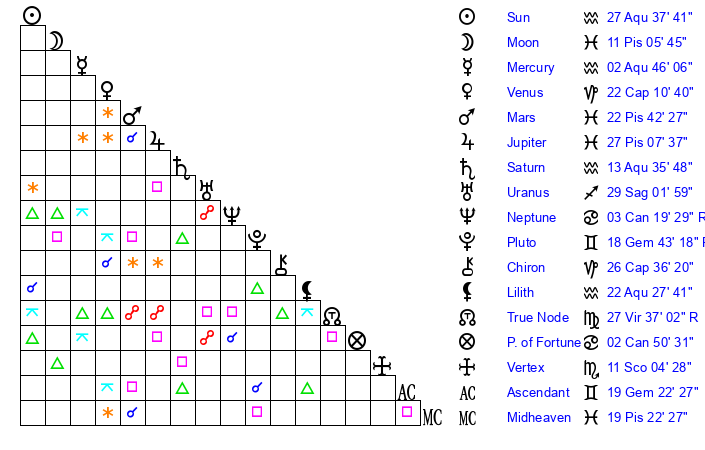 | Pluto | 18 Gemini 44 | 2 Aquarius 34 | 20 Gemini 20 |