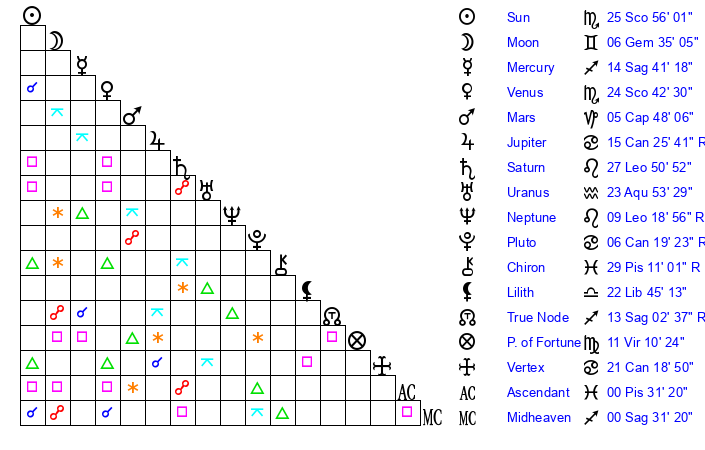 | Sun | 25 Scorpio 56 | 27 Scorpio 14 | 13 Pisces 27 |