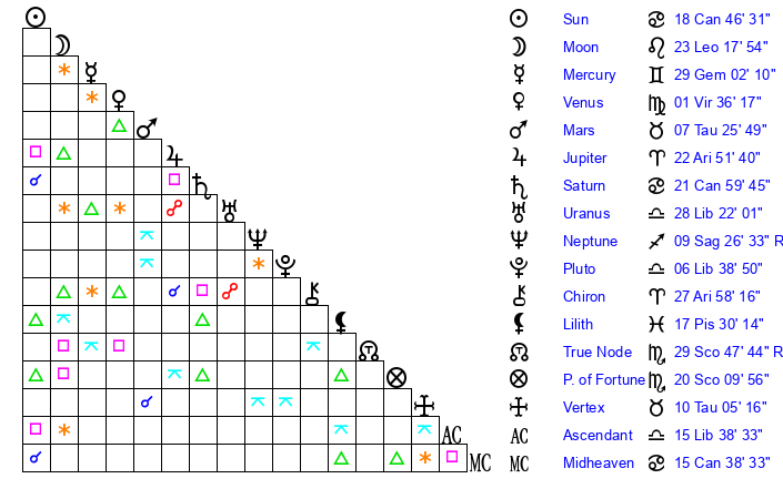 | Moon | 23 Leo 17 | 29 Capricorn 53 | 15 Gemini 15 |