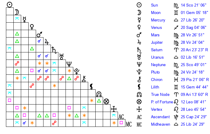 Sun | 14 Scorpio 21 | 14 Scorpio 47 | 11 Capricorn 7 |