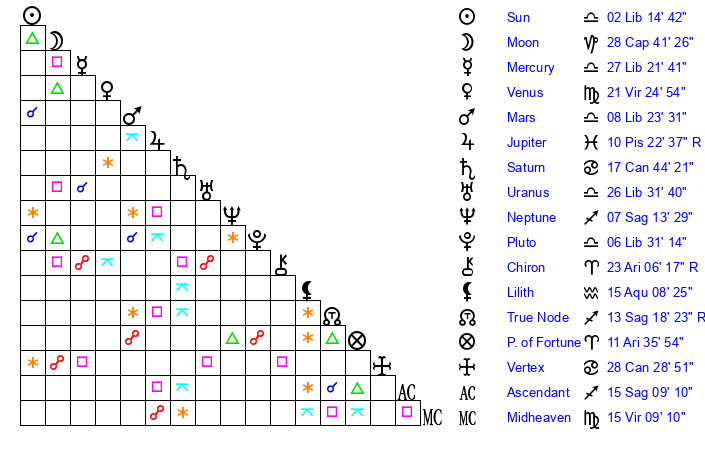 | Sun | 2 Libra 14 | 2 Libra 53 | 22 Scorpio 57 |