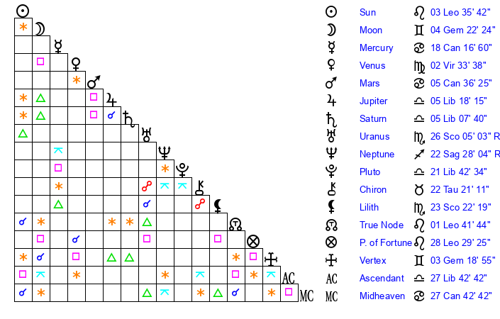 | Venus | 2 Virgo 34 | 24 Gemini 52 | 25 Libra 2 |