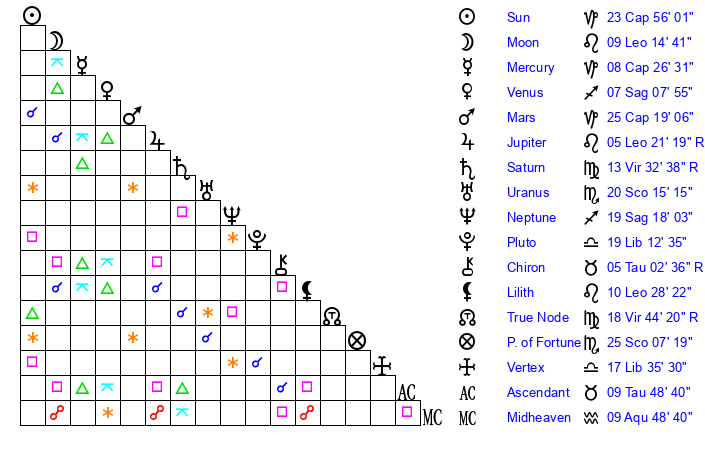 | Moon | 9 Leo 13 | 4 Leo 16 | 21 Aries 42 |