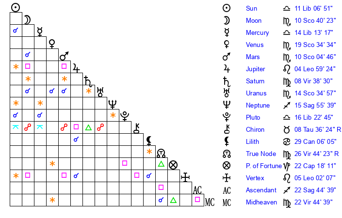 | Venus | 19 Scorpio 34 | 18 Virgo 38 | 8 Scorpio 36 |