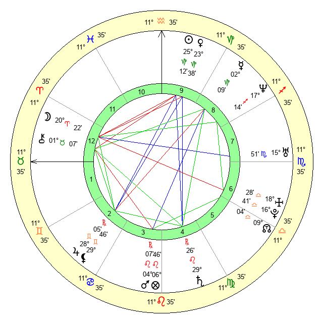 | Moon | 20 Aries 23 | 17 Leo 19 | 0 Capricorn 42 |