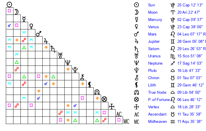 | Moon | 20 Aries 23 | 17 Leo 19 | 0 Capricorn 42 |