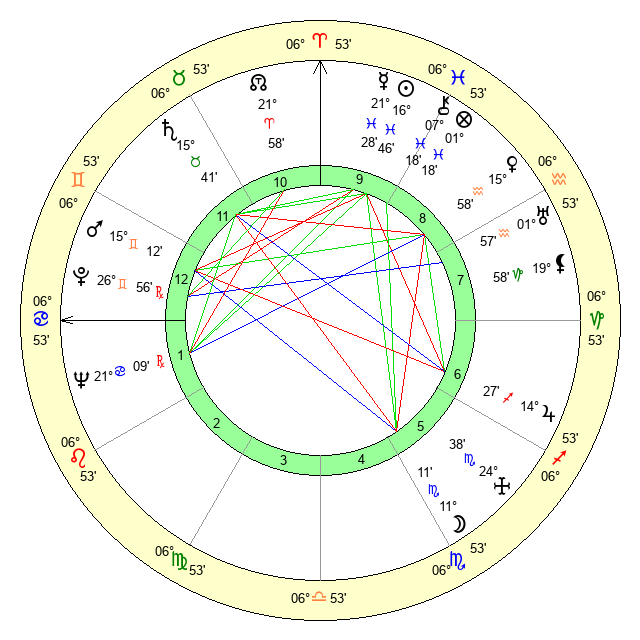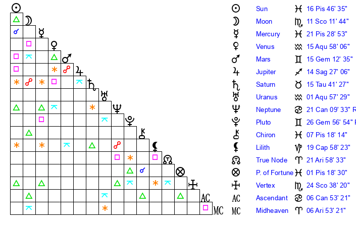 | Sun | 16 Pisces 46 | 17 Pisces 22 | 6 Cancer 35 |