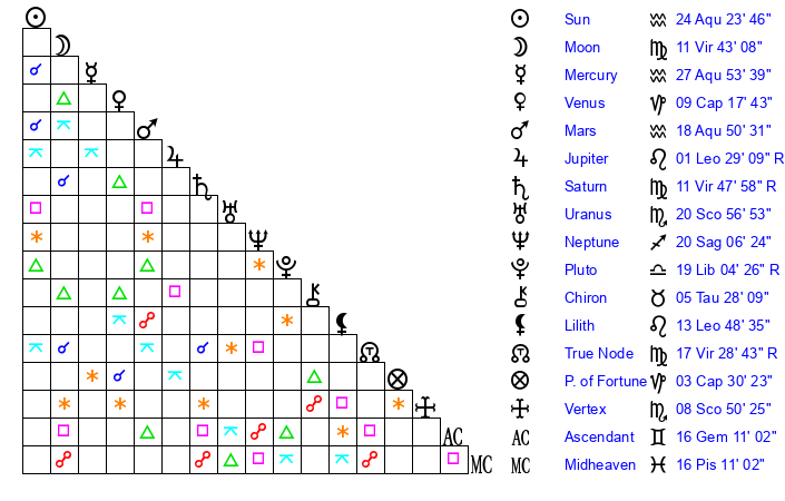 Moon | 11 Virgo 44 | 8 Virgo 8 | 27 Taurus 11 |