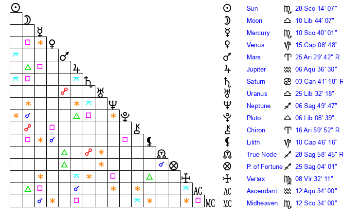 Sun | 28 Scorpio 14 | 28 Scorpio 52 | 20 Capricorn 5 |