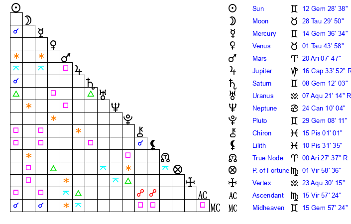 | Sun | 12 Gemini 29 | 13 Gemini 22 | 0 Libra 3 |