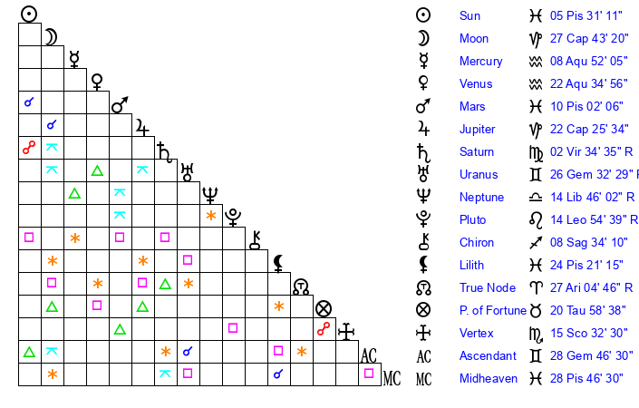 | Sun | 5 Pisces 31 | 6 Pisces 5 | 20 Taurus 25 |