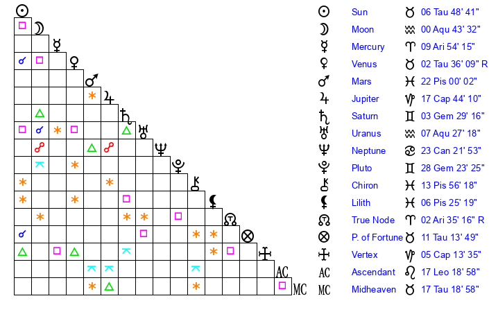 | Moon | 0 Aquarius 45 | 6 Taurus 15 | 3 Pisces 29 |