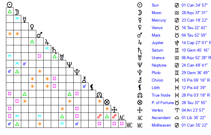 | Moon | 28 Aquarius 36 | 8 Gemini 40 | 2 Aries 57 |