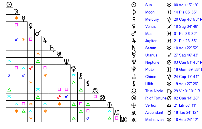 | Saturn | 10 Aquarius 48 | 16 Pisces 17 | 21 Aquarius 23 |