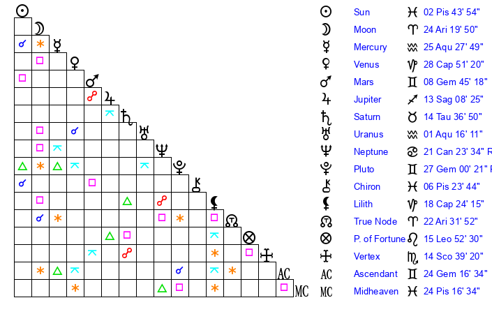 | Sun | 2 Pisces 43 | 4 Pisces 19 | 23 Gemini 13 |