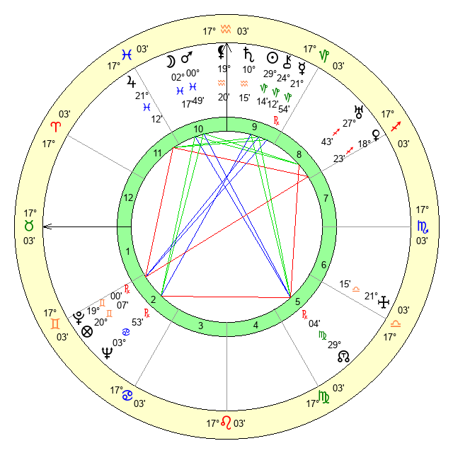 | Moon | 2 Pisces 19 | 18 Libra 25 | 6 Leo 38 |