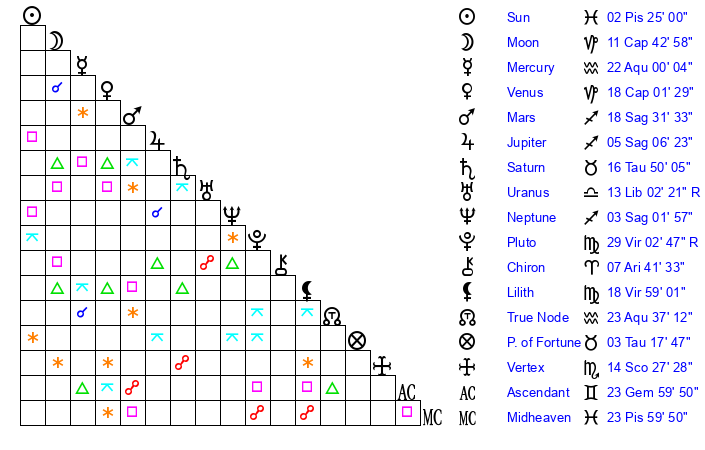 Pluto | 29 Virgo 2 | 2 Aquarius 41 | 27 Virgo 37 |