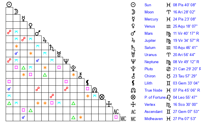| Sun | 8 Pisces 40 | 9 Pisces 21 | 8 Gemini 48 |