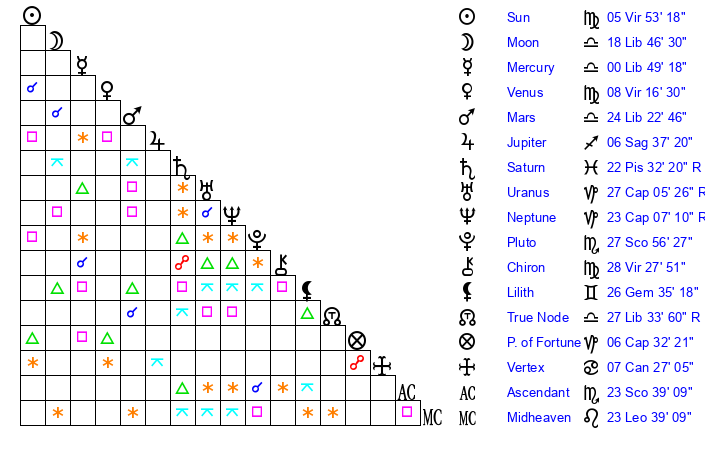 Moon | 18 Libra 49 | 19 Scorpio 37 | 26 Scorpio 39 |