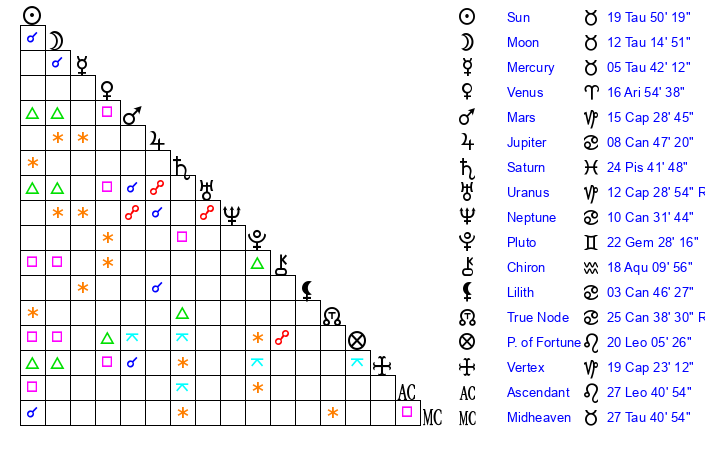 | Moon | 12 Taurus 6 | 10 Scorpio 19 | 29 Leo 38 |