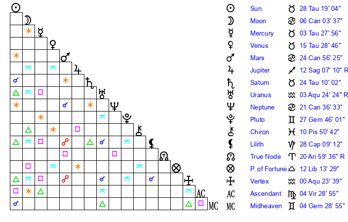 | Saturn | 24 Taurus 44 | 29 Pisces 28 | 4 Gemini 43 |