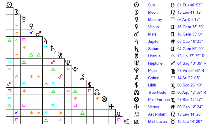 Sun | 1 Taurus 40 | 1 Taurus 50 | 22 Gemini 45 |