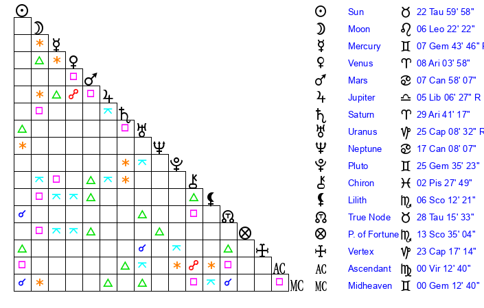| Sun | 23 Taurus 0 | 24 Taurus 9 | 13 Virgo 12 |