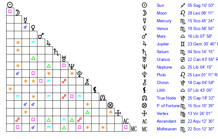 | Venus | 19 Scorpio 59 | 18 Capricorn 52 | 19 Aquarius 14 |