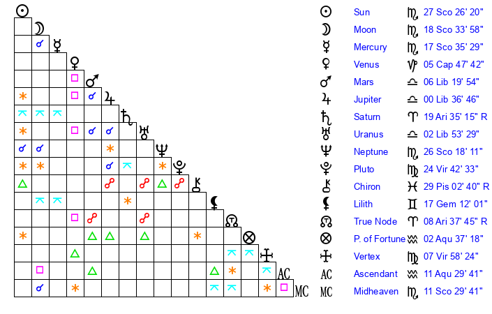 Sun | 27 Scorpio 26 | 27 Scorpio 51 | 24 Capricorn 22 |