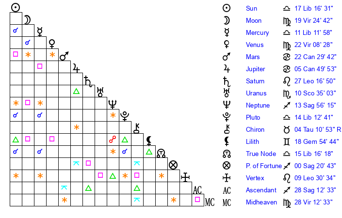 | Venus | 22 Virgo 8 | 26 Virgo 3 | 22 Scorpio 0 |