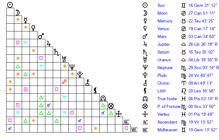 Sun | 16 Gemini 31 | 17 Gemini 12 | 9 Leo 1 |