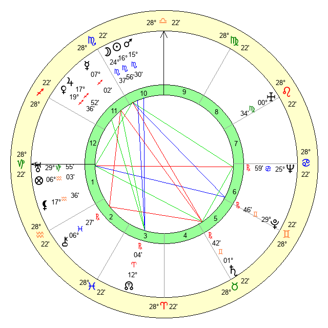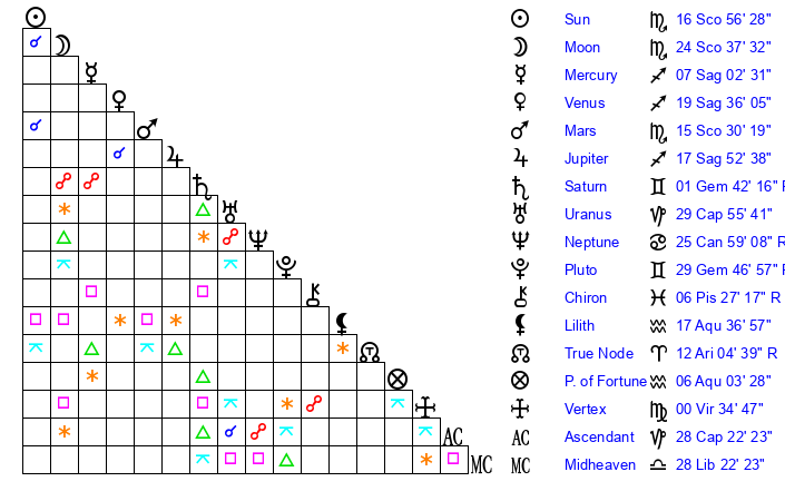 | Moon | 24 Scorpio 36 | 15 Cancer 28 | 13 Capricorn 45 |