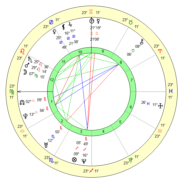 | Moon | 7 Virgo 11 | 7 Capricorn 55 | 7 Gemini 49 |