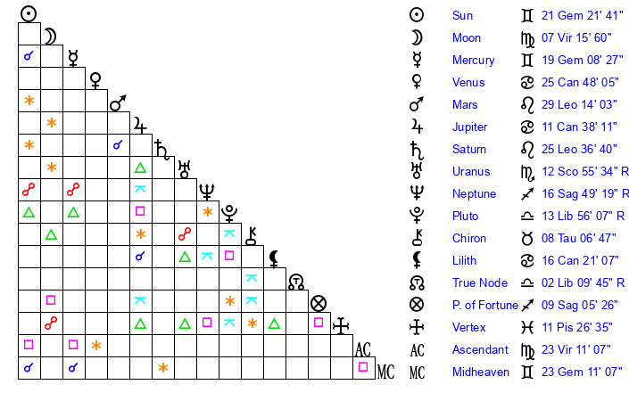 | Moon | 7 Virgo 11 | 7 Capricorn 55 | 7 Gemini 49 |