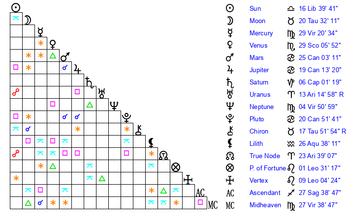 | Sun | 16 Libra 40 | 17 Libra 38 | 22 Capricorn 34 |