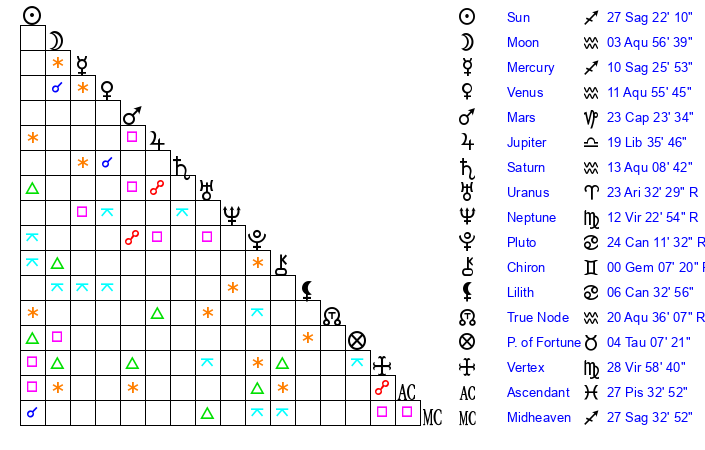 Venus | 11 Aquarius 55 | 14 Aquarius 12 | 16 Aquarius 41 |