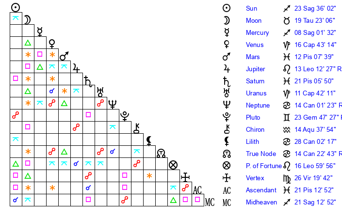 | Sun | 23 Sagittarius 36 | 24 Sagittarius 59 | 22 Aries 23 |